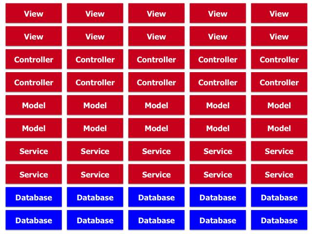 满足这个条件的架构在初期是非常令人愉悦的。上一部分我们描述的框架都符合这种架构。这个阶段开发非常快:IDE打开很快,开发功能完成很快,团队这个时候往往规模较小,交流也没有问题。所有人都很高兴——因为用了新技术,因为这个架构是如此的简单、清晰、有效。