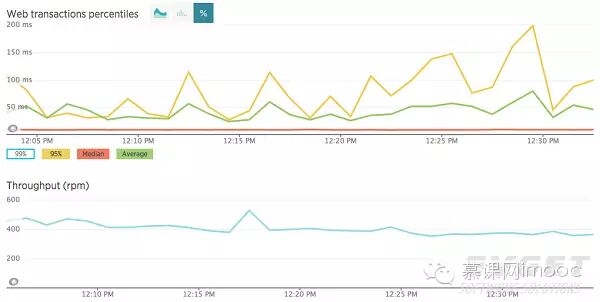 我们可以使用APMs(例如New Relic或AppDynamics)来衡量这些指标。使用这些工具,你可以在主报告仪表板中将平均响应时间与昨天的甚至上周的直接进行对比。这有助于我们观察新的部署是否会影响到我们的应用程序。你可以看到网络传输的百分比,测量HTTP完成请求需要多长时间。