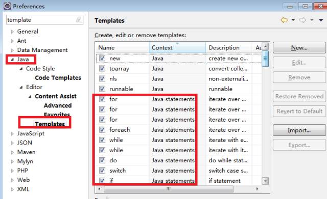 Window–>Preferences–>Java–>Templates