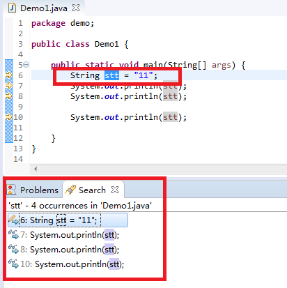 如果想知道字符串stt在Demo1.java这个文件中出现的地方,直接按下Ctrl+Shift+U 就可以显示出来。