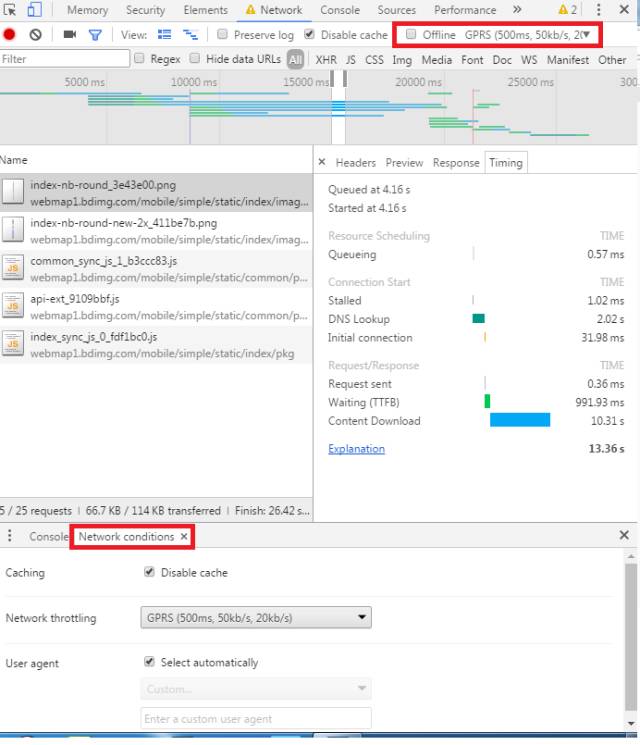 B:有两个路径开启网络限速,Network中,选择throttling或者在More Tool中,打开Network Condition并选择你的Network throttling: