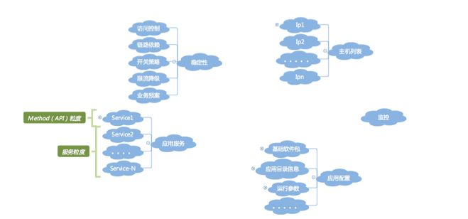 上面我们定义出来的一个个应用,都是从业务角度入手进行拆分细化出来的业务逻辑单元。它虽然可以独立部署和运行,但是每一个应用都只具备相对单一的业务职能。如果要完成整体的业务流程和目标,就需要和周边其它的服务化应用交互。同时,这个过程中还需要依赖各种与业务无直接关系、相对独立的基础设施和组件,比如机器资源、域名、DB、缓存、消息队列等等。