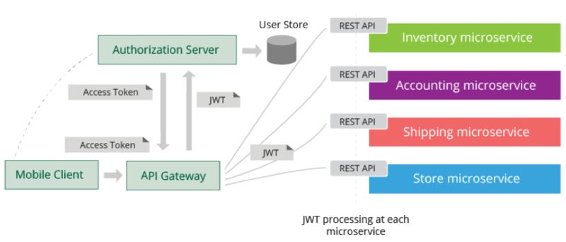 每个微服务包含 JWT 客户端,能够解密 JWT 并获取其中的用户会话信息。