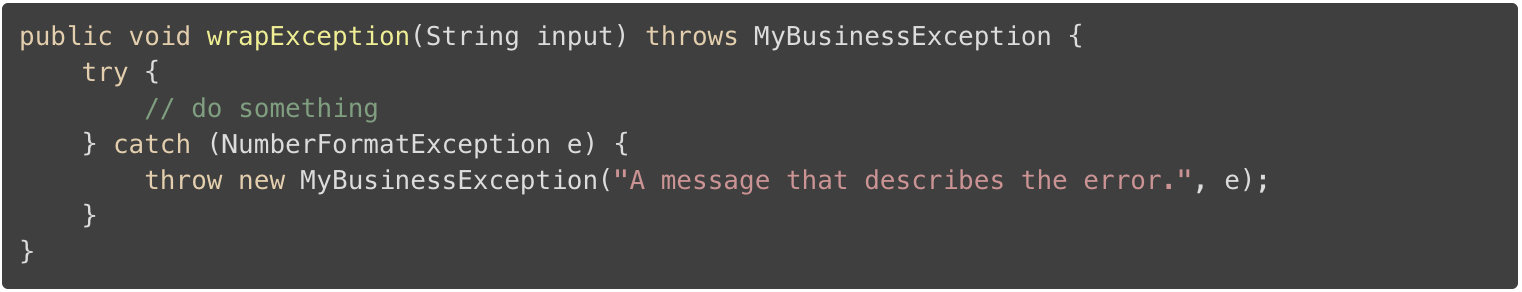 在你这样做时,请确保将原始异常设置为原因(注:参考下方代码 NumberFormatException e 中的原始异常 e )。Exception 类提供了特殊的构造函数方法,它接受一个 Throwable 作为参数。另外,你将会丢失堆栈跟踪和原始异常的消息,这将会使分析导致异常的异常事件变得困难。