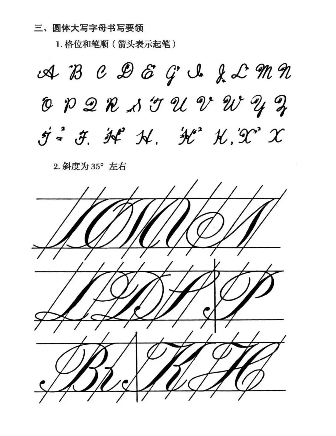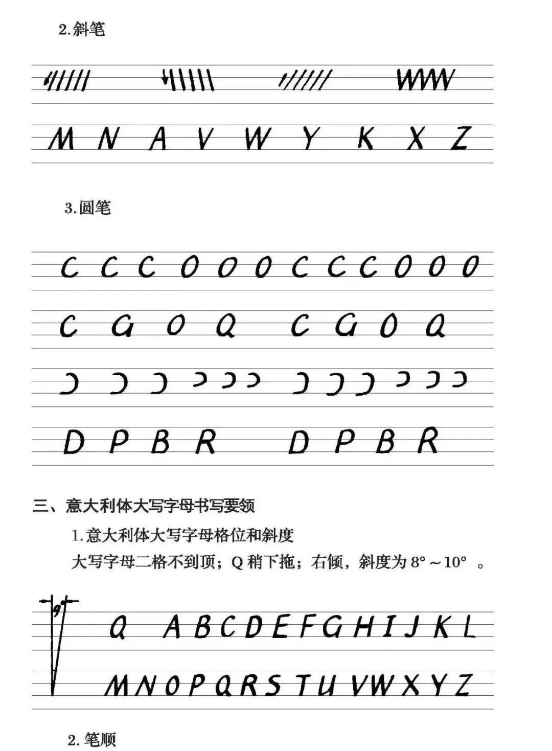 每个字母都应稍向右倾斜,约5°,斜度要一致。