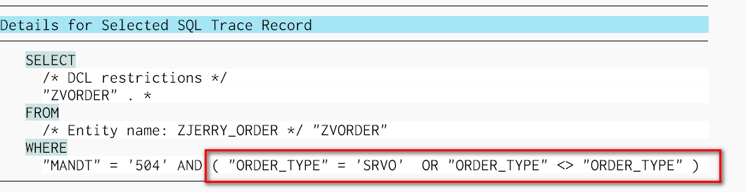 You can find there is a fragment of WHERE statement automatically added. The value for ORDER_TYPE comes from the value of authorization object field PR_TYPE which is mapped to CDS view field ORDER_TYPE in my DCL object.
