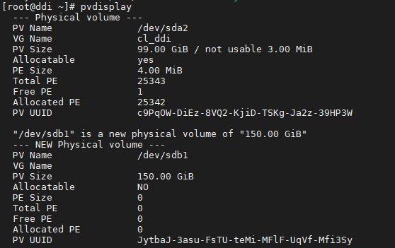 再次进行pvdisplay查看,新加的磁盘就显示出来了。