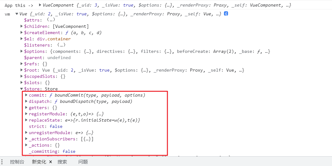 控制台输出vm和vc对象,可以看到$store已经可以正常访问