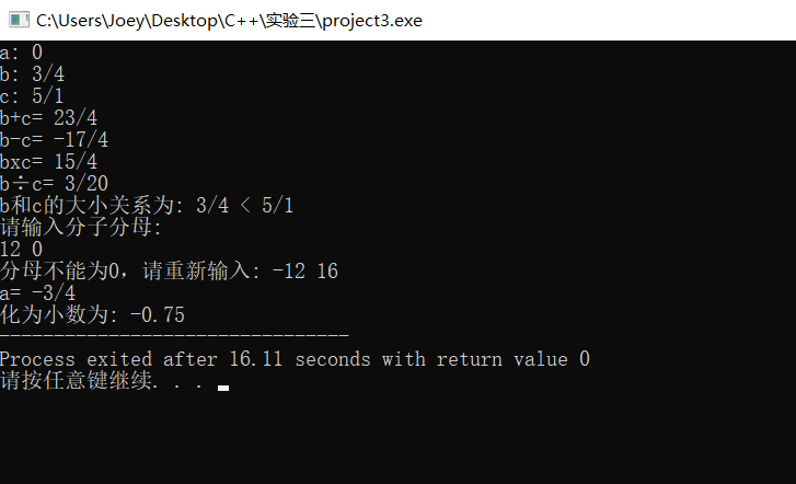 4.化简的时候出现了分母为负数,分子为正数的情况(输入的时候分子为负,分母为正),然后就觉得可能是最大公因数可能为负数的原因,然后那个函数我返回的是最大公因数的绝对值,就好了。