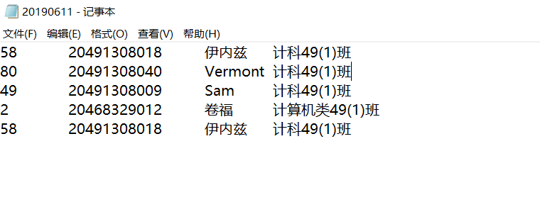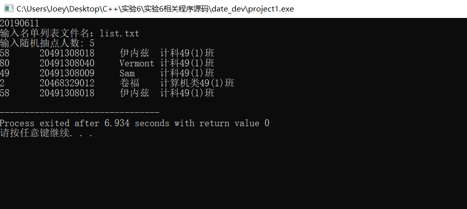 #include <iostream> #include <string> #include "utils.h" #include <fstream> #include <cstdlib> #include <time.h> using namespace std; int main() { string filename,listfilename,name; filename = getCurrentDate(); cout << filename << endl; int n,num[100],luckydog,i=1,j; cout << "输入名单列表文件名:"; cin >> listfilename; cout << "输入随机抽点人数: " ; cin >> n; ifstream fin; ofstream fout; fin.open(listfilename); if(!fin.is_open()){ cerr << "fail to open " << listfilename << endl; system("pause"); exit(0); } fout.open(filename,ios_base::app); if(!fout.is_open()){ cerr << "fail to open " << filename << endl; system("pause"); exit(0); } srand(time(0)); while(n--){ luckydog=1+rand()%83; num[i]=luckydog; i++; fin.clear(); fin.seekg(0); for(j=1;j<=luckydog;j++) getline(fin,name); fout << name << endl; cout << name << endl; } fout << endl; fin.close(); fout.close(); return 0; }