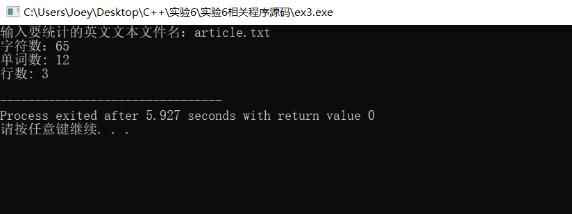 #include<iostream> #include<cstdlib> #include<string> #include<fstream> using namespace std; int main(){ string filename; cout << "输入要统计的英文文本文件名:"; cin>>filename; ifstream fin; fin.open(filename); if(!fin.is_open()){ cerr << "fail to open " << filename << endl; system("pause"); exit(0); } int num_ch=0,num_word=0,num_line=0; char ch; int flag=1; while(fin.get(ch)){ if(ch==' '){ num_ch++; if(flag==0)//如果有空格就能统计后面的单词 flag=1; } else if(ch=='\n'){//换行时统计行数 num_line++; if(flag==0) flag=1; } else if(flag&&((ch>='a'&&ch<='z')||(ch>='A'&&ch<='Z'))){ //统计单词数以及单词的第一个字符 flag=0; num_ch++; num_word++; } else num_ch++; //单词剩下的字符数 } if(ch!='\n')//如果最后一个字符不是换行,行数加一 num_line++; cout << "字符数:" << num_ch << endl; cout << "单词数: " << num_word << endl; cout << "行数: " << num_line << endl; fin.close(); return 0; }