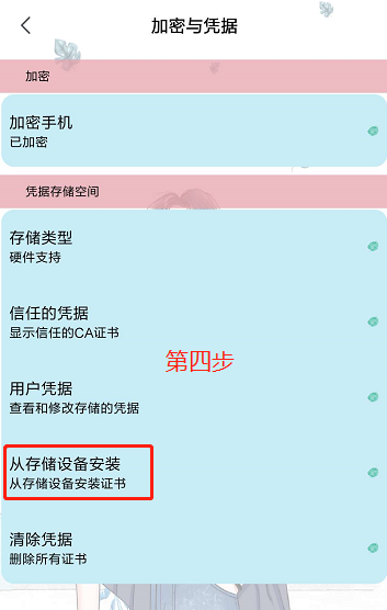 设置—>更多设置—>系统安全—>加密与凭据—>从存储设备安装—>选择要安装的fiddlerroot.cer证书—>输入锁屏密码