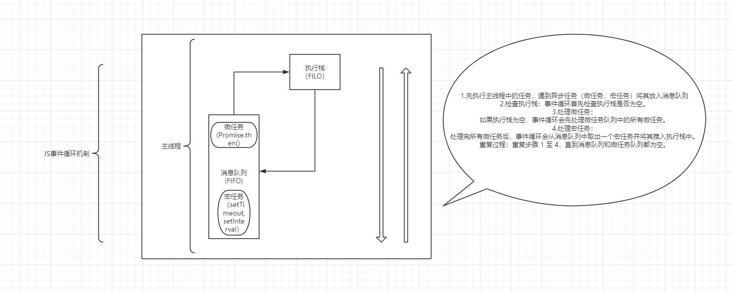 - 重复过程:重复步骤 1 至 3,直到消息队列和微任务队列都为空。