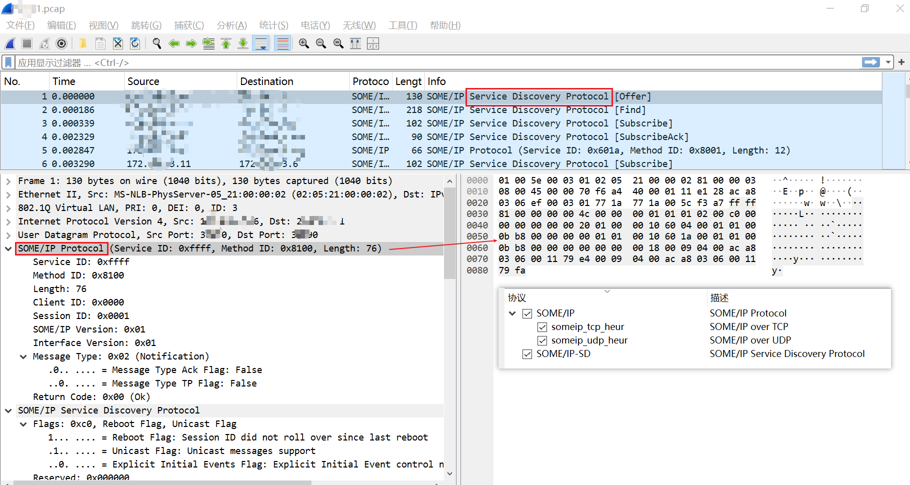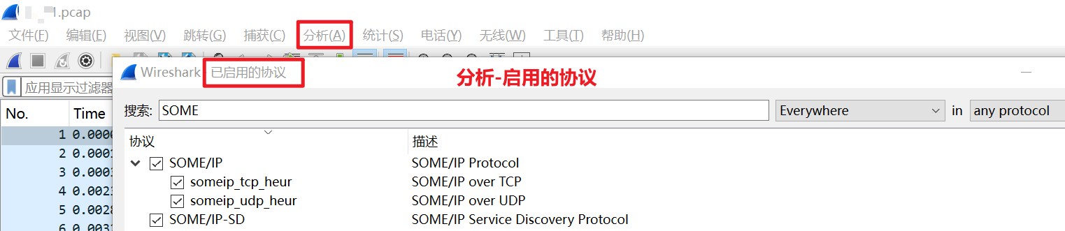 Wireshark采集数据需要启用SOME/IP协议【分析】-【启用协议】-搜索SOMEIP-选中SOMEIP协议