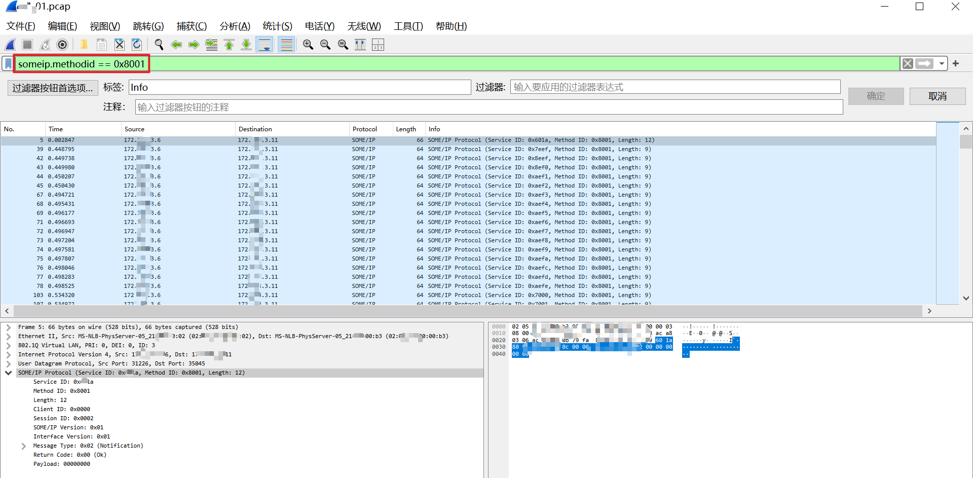 仅监听:协议=SOME/IP,MethodId=0x8001的报文