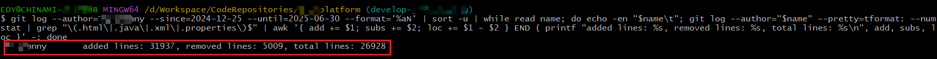 git log --author=xxx --since=2024-08-30 --until=2025-04-31 --pretty=tformat: --numstat | grep "\(.html\|.java\|.xml\|.properties\)$" | awk '{ add += $1; subs += $2; loc += $1 - $2 } END { printf "added lines: %s, removed lines: %s, total lines: %s\n", add, subs, loc }'