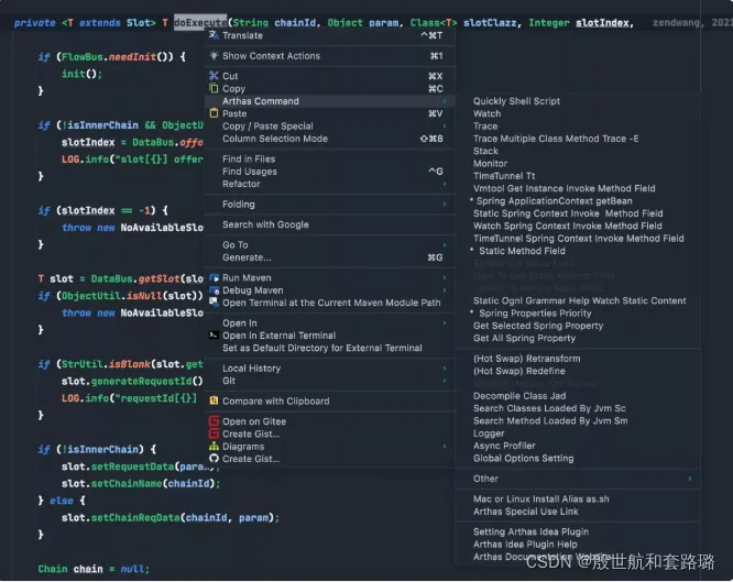 使用起来非常方便,进入代码片段,选择你要诊断的类或者方法上面,右击打开Arthas命令,选择一项,即可自动生成命令,省去你敲打命令的时间。