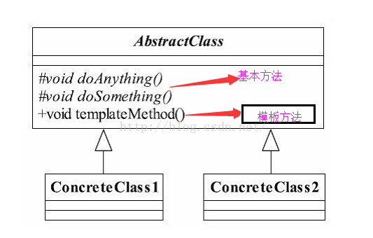 - 模板方法:可以有一个或者几个,一般是具体的方法,也就是一个框架,实现对基本方法的调度,完成固定的逻辑。