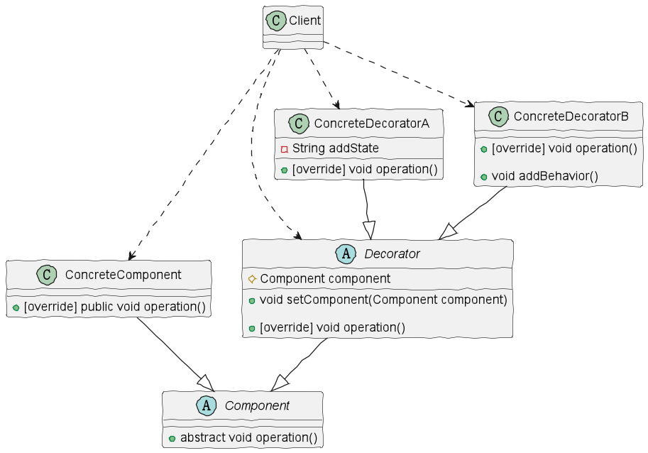 concreteDecoratorB.setComponent(concreteDecoratorA); //装饰类B包装装饰类A(对象已经被包装在装饰类A中)