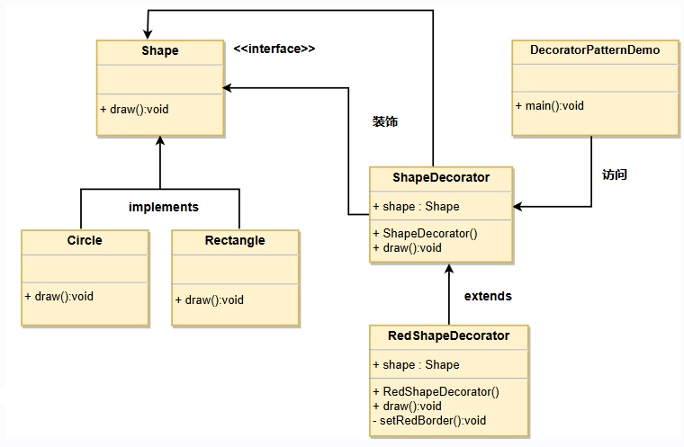然后我们创建一个实现了 Shape 接口的抽象装饰类 ShapeDecorator,并把 Shape 对象作为它的实例变量。