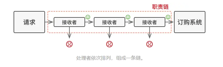 - 责任链模式是一种行为设计模式:允许你将请求沿着处理者链进行发送。收到请求后,每个处理者均可对请求进行处理,或将其传递给链上的下个处理者。