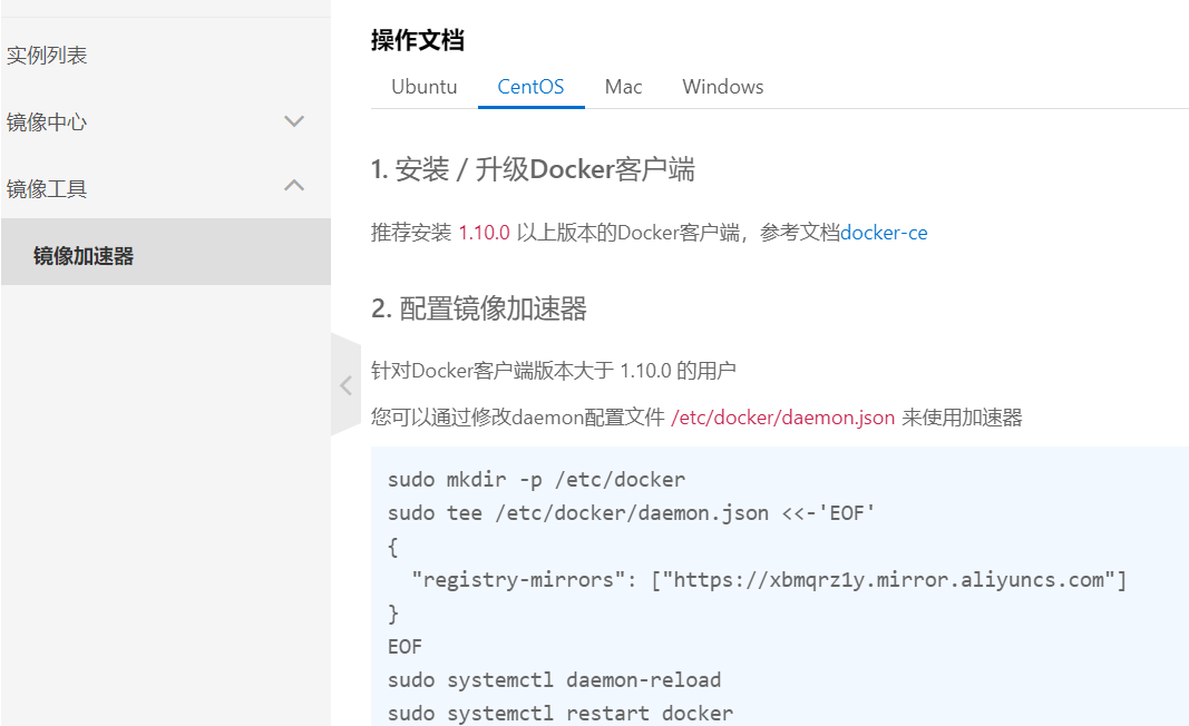 需登录,系统分配(https://<阿里云容器镜像服务为你随机分配的ID>.mirror.aliyuncs.com) |