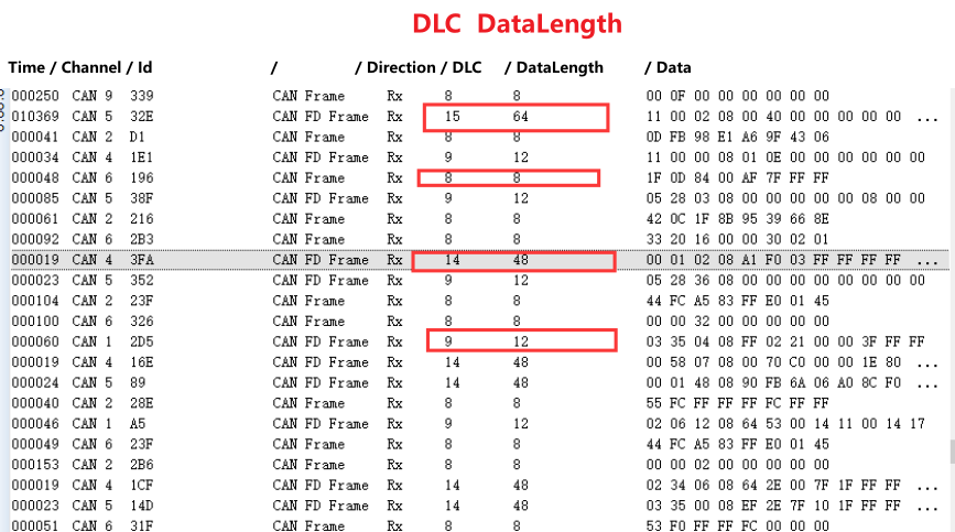 若是CAN-FD拓展帧时,DLC值表示范围0-15,Data Length表示的范围0-64,且当DLC<=8时,DLC和Data Length的值相同,当DLC>8时,需要满足上述的映射表。(如下图实例)