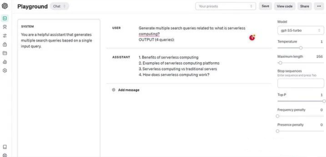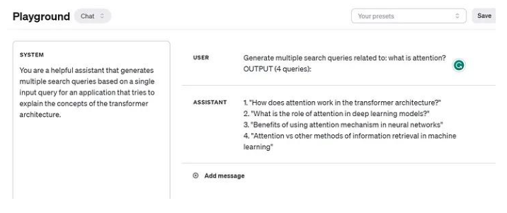 由于在这个语境下理解“注意力”的含义依赖于上下文,LLM对这个含义产生了误解,并生成了一些与之完全无关的搜索查询。这可能导致您的应用得出糟糕的结果。现在,来看一下通过更改系统提示,将其改为“您是一个有用的助手,可以根据单一输入查询为试图解释transformer架构概念的应用生成多个搜索查询”,是如何在这个特定例子中解决这个问题的。