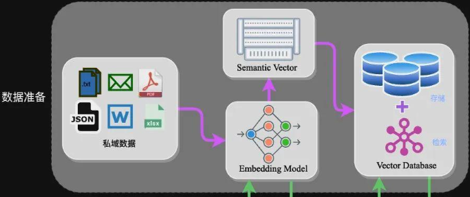 - 数据准备一般是一个离线的过程,主要是将【私域数据】向量化后构建索引并存入向量数据库的过程。