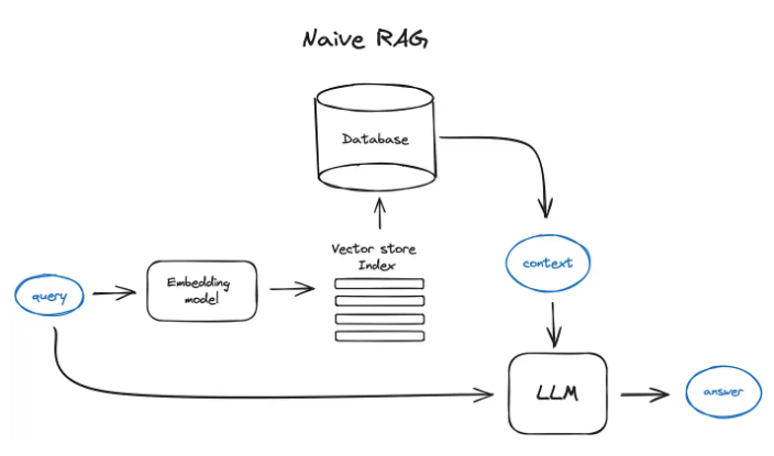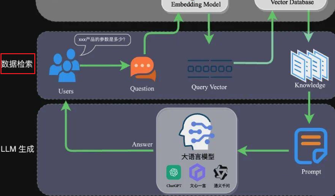 - 应用阶段:用户提问 -->数据检索(召回) --> 注入Prompt --> LLM生成答案