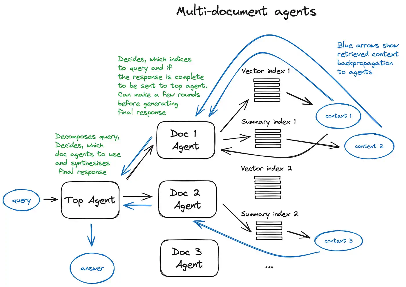 每个文档智能体都有两个工具:向量存储索引和摘要索引,它根据路由查询决定使用哪一个。对于顶级智能体来说,所有文档智能体都是其工具。