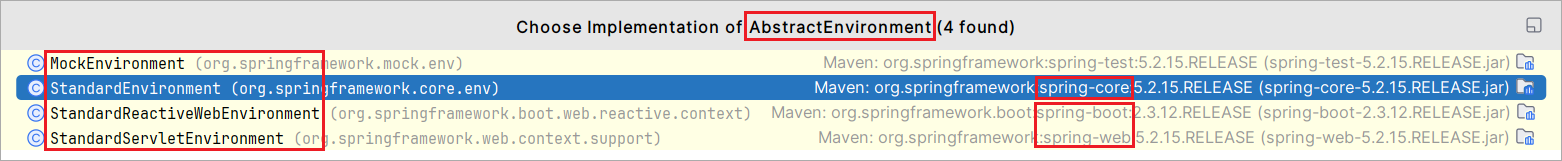 org.springframework.core.env.StandardEnvironmentextends AbstractEnvironment - (Interface)