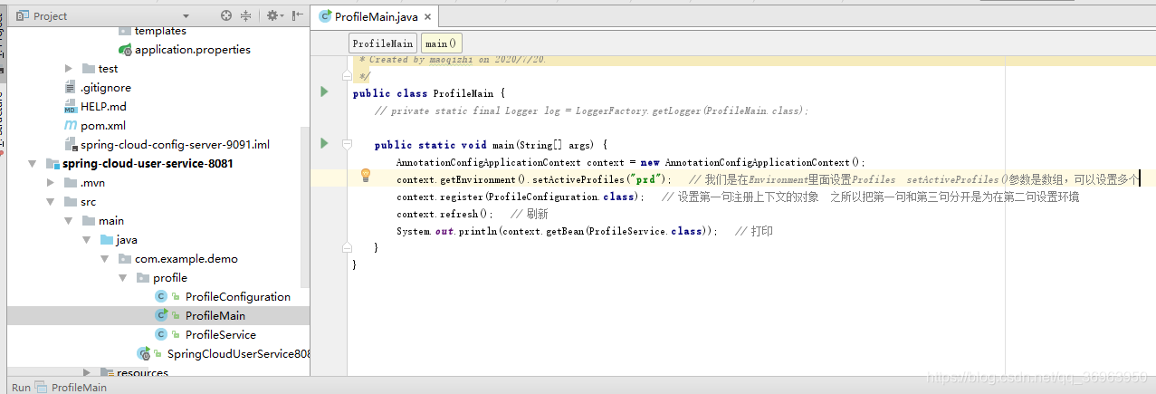 - 新建一个ProfileConfiguration配置类,将新建的ProfileService类的实例bean定义在这里,等到springboot项目启动的时候,将可以将ProfileService实例bean装载的ioc容器中去了,整个如下: