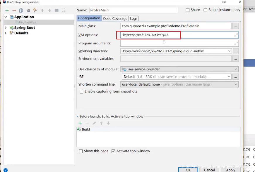 SpringbootApplication类启动了,直接写一个main方法启动即可。例如如下,在启动之前,在Environment里面设置profile,setActiveProfile() 参数是数组,可以设置多个。- 这里测试之用,先设置“prd”,最后context.getBean可以取出ioc容器中的bean,打印到控制台就好。
