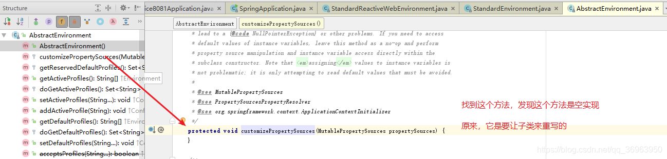 接着往下看,可以看到,configureEnvironment方法先后执行了两个方法,就是 configurePropertySources(environment, args); 和 configureProfiles(environment, args); ,就是整个spring应用运行的环境信息:profiles + properties,就是在这两个方法里面解析出来的。
