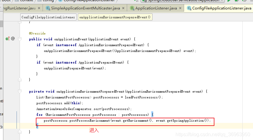 任意找一个,这里找ConfigFileApplicationListener类,可以看到对于通过event类型,执行了不同操作,如下: