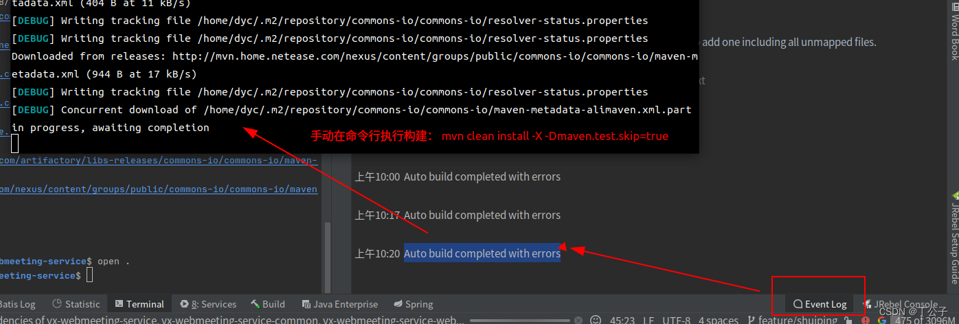 - 针对原因2,如果不是“可能原因1”中的问题, 可以先看下 idea 的event log, 是否有构建异常, 比如我这里出现的 “Auto build completed with errors”. 由于不明确具体是什么构建异常, 可以进入命令行手动执行构建命令: