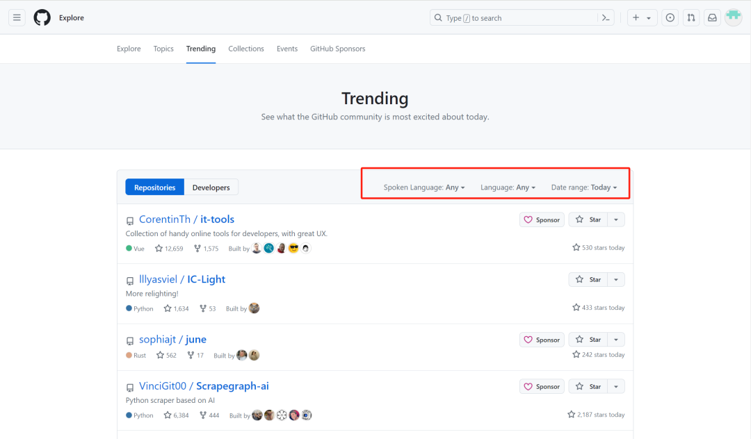 访问GitHub官方页面,通过Explore进入Trending页面,查看当天所有语言的热门项目。通过切换筛选条件,可以查询特定语言或时间范围的热门趋势。