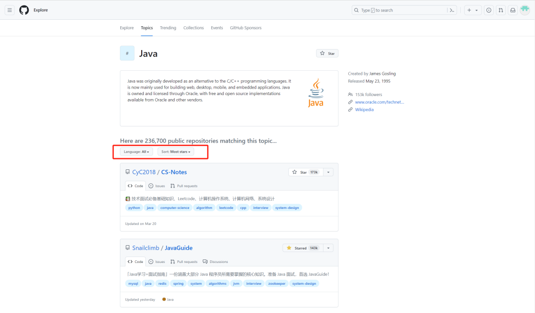 例如,查看Java项目的Star排行: https://github.com/topics/java?o=desc&s=stars