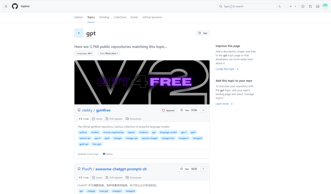 再比如,查找很火的AI领域或GPT领域的项目: https://github.com/topics/gpt