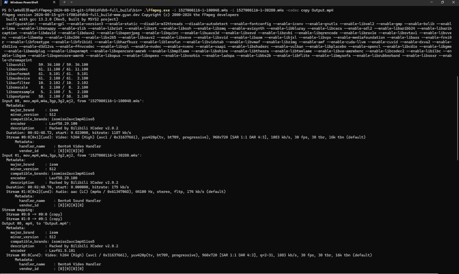 C:\Users\xxx\Downloads>ffmpeg -i videoplayback.2.mp4 -i videoplayback.mp4 -c:v copy -c:a copy -map 0:v:0 -map 1:a:0 output_video.mp4