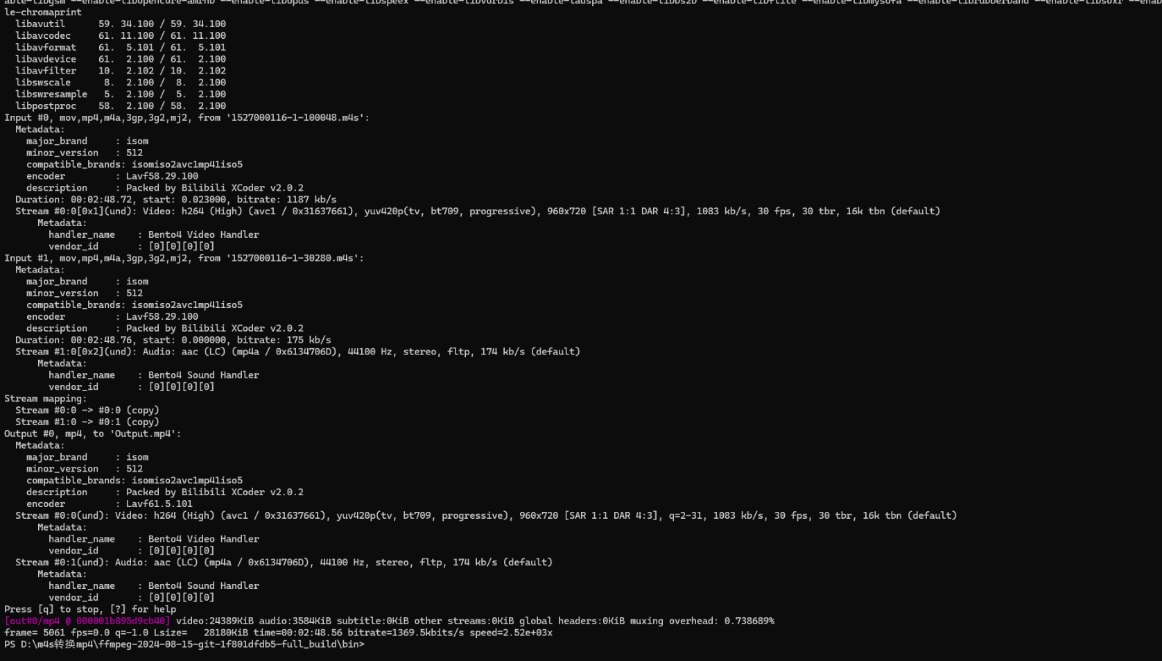 [out#0/mp4 @ 000001da388b9280] video:90773KiB audio:12811KiB subtitle:0KiB other streams:0KiB global headers:0KiB muxing overhead: 0.595182%
