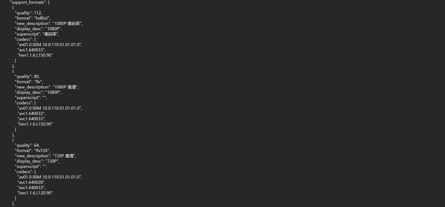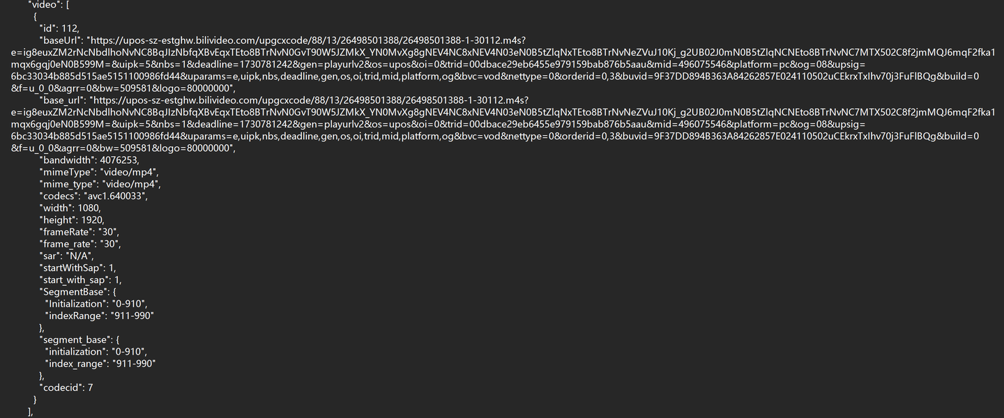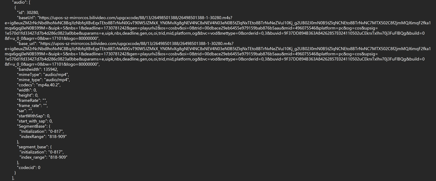 playurl文件:通常保存了音视频分片的播放 URL 信息、音视频流链接、支持的编解码封装格式、不同清晰度分辨率下的码率等信息。