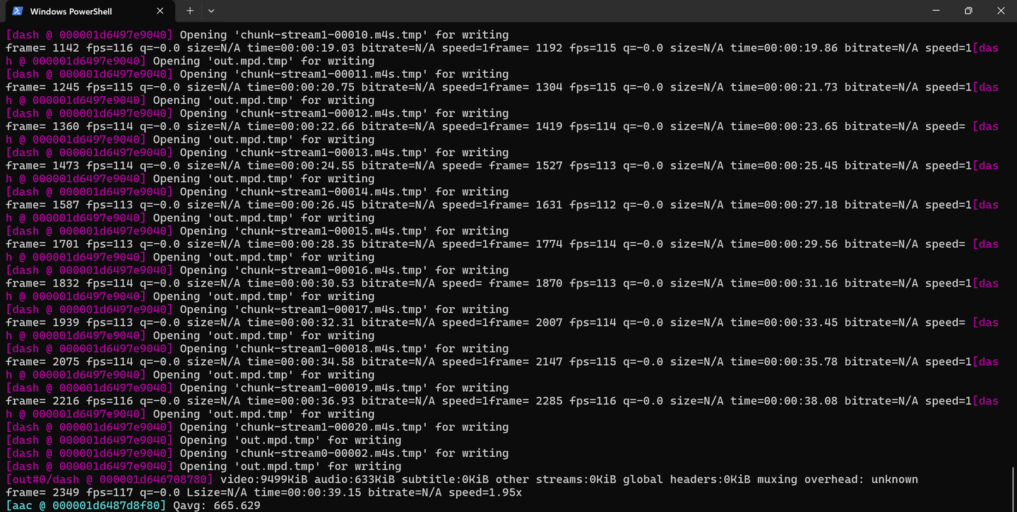 如下日志显示生成了多组 chunk-stream1-000XX.m4s 片段,这些是按 -seg_duration 2 选项指定的2秒时长分段生成的;out.mpd.tmp 清单文件也在不断更新中,描述所有 M4S 片段的顺序、时间戳等信息,最终得到的 out.mpd 文件应包含了每个 M4S 文件的引用;结尾汇总帧和速率信息以及音视频数据量表明转化顺利,音视频流已正确封装入文件,Qavg: 665.629 属于音频质量评估信息。