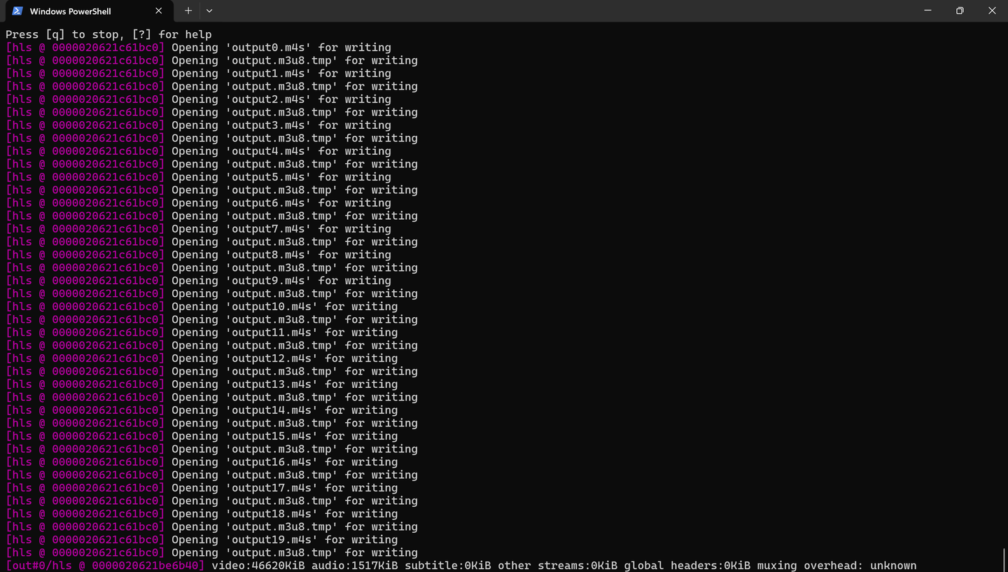 执行此命令后,FFmpeg 将生成 output.m3u8 播放列表文件以及一系列output*.m4s命名的多个 M4S 分段文件,内容为分段的音视频流,持续时间为 2 秒。
