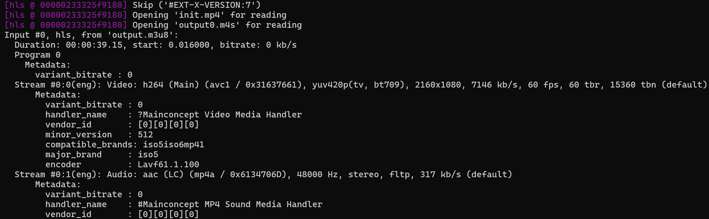 客户端首先下载 output.m3u8 文件解析视频的基本结构,接着加载 init.mp4 获取视频和音频轨道的基础信息,再按照 m3u8 文件指示的顺序依次加载 .m4s 文件,并将其解码播放。