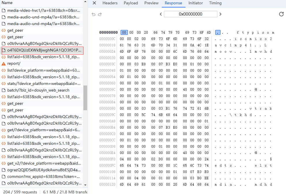 片段文件 chunk-stream1-*.m4s:实际的视频或音频片段 Media Segment,文件名中的编号通常表示时间戳或片段序号来按时间顺序排列播放。在 DASH 流中第一个片段 chunk-stream1-00001.m4s 文件通常包含了第一个片段所需的关键帧(I 帧)以及视频流的解码信息,作为后续片段的参考帧,因此数据量较大,后续的片段大多为非关键帧(P 或 B 帧),数据量较小。