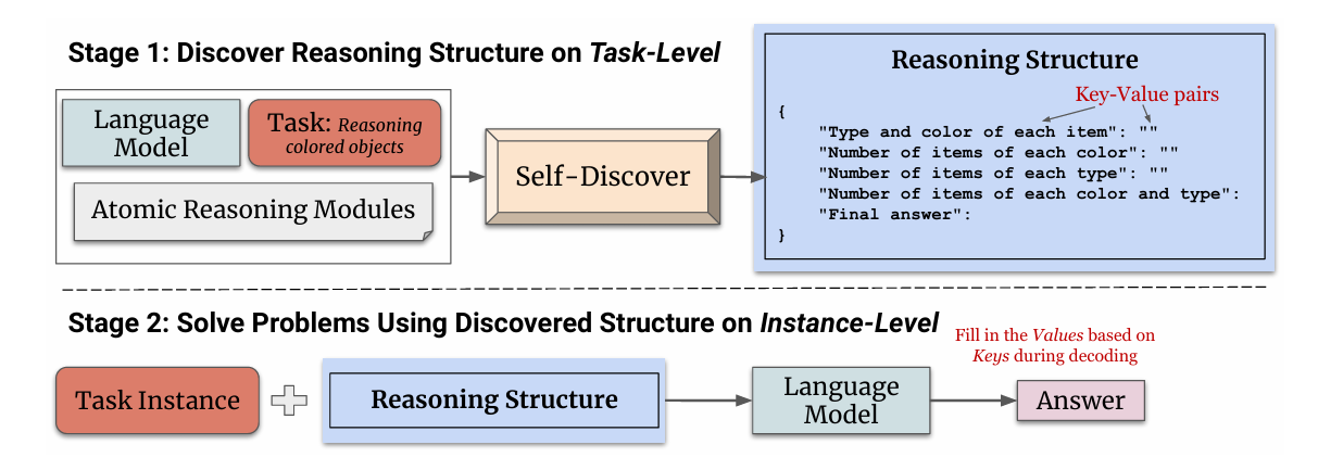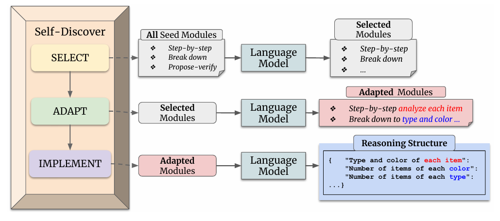 这种方法的核心是一个自发现过程,它允许大型语言模型在没有明确标签的情况下,自主地从多个原子推理模块(如批判性思维和逐步思考)中选择,并将其组合成一个推理结构。