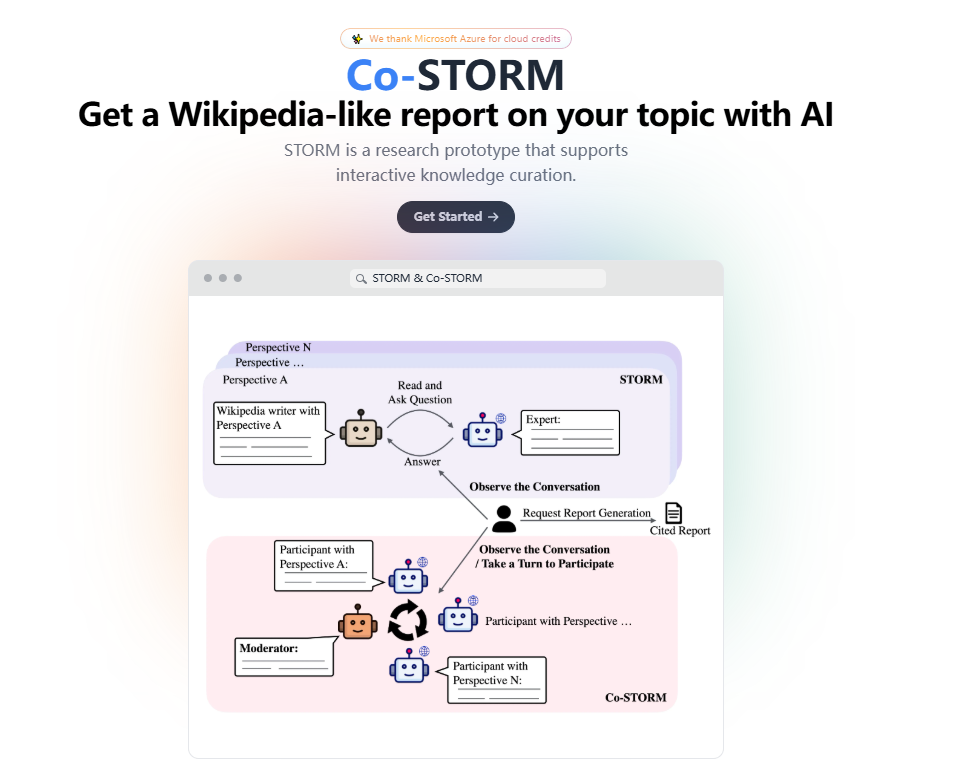 STORM(Synthesis of Topic Outlines through Retrieval and Multi-perspective Question Asking, 通过检索和多视角提问的方式模拟对话),在其他的一些如 Agent 的九种设计模式 里被理解成多 Agent 协作的一种设计模式。