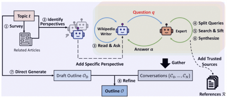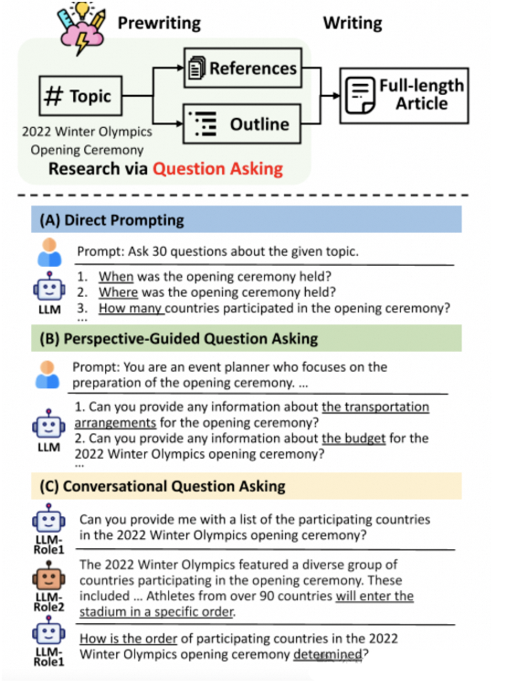 它首先通过检索和分析来自类似主题的维基百科文章来发现多样化的视角,然后针对提问对LLM进行人格化 (如下图所示):